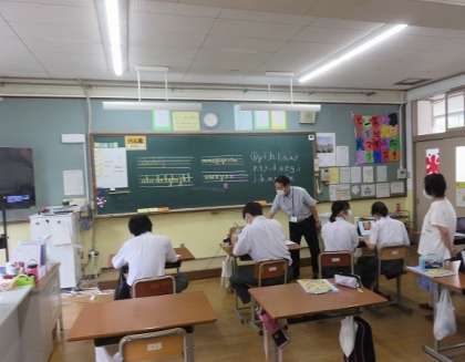 2・3年1組の英語は、アルファベットの小文字を練習しました。その後、端末を活用し、行きたい国とその国で有名な食べ物を調べ、I want to go to 〜 の英文を完成させました。