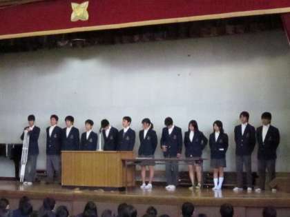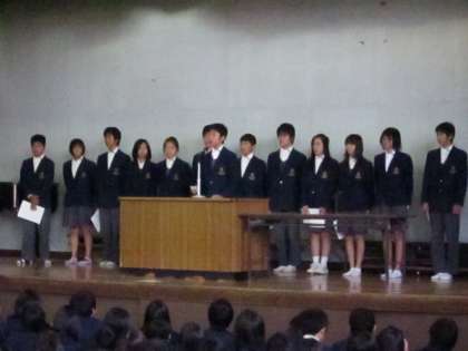 続く認証式では,前生徒会長のあいさつの後,新しく選出された新生徒会役員が,校長先生より認証状と激励の言葉を受け取りました。最後に新生徒会長から所信表明があり,新生徒会がスタートを切りました。