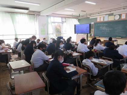 1年6組の数学は、比例式を学習しました。用意された粉とさとうの量が増える前後で、それぞれの量の割合が等しくなるためには、どれくらいの量を増やしたらいいのかを比例式を使って求めました。