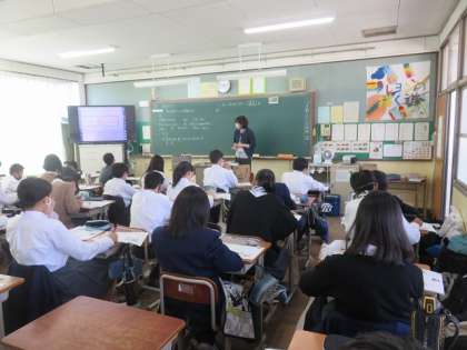 1年4組の理科は、光の進み方について説明することを目標に、光が同じ物質を通る時はどのように進むか、線香の煙を充満させた容器に光を当ててみんなで確認しました。また暗闇の中で白い紙は見えるかどうか全員で考え、意見を交わしました。