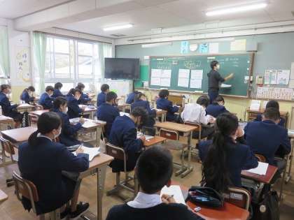 2年4組の理科は、電圧の大きさの関係を理解することを目標に授業を行いました。豆電球を直列につないだ時と、並列につないだ時とでは電圧の大きさがどのように変わるかをグループで考え、発表しました。