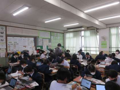 1年6組の社会は、縄文・弥生それぞれどのような時代であったかを考える授業を行いました。今日は「〇〇が生まれた縄文時代」をテーマに、各自で○○を設定し、タブレット端末を活用して調べました。次回はグループ内で発表をします。