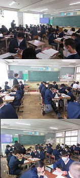 2年5組の数学は、二等辺三角形の性質について、仮定と結論の逆が正しいかどうかを、証明を根拠として考えました。また証明するために、どのような筋道を立てなければいけないかをグループで考えました。