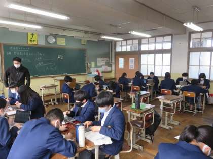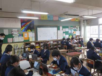 3年7組の保健体育は、感染症の広がりの単元で、感染症の予防方法について考えることを目標に授業を行いました。GIGA端末を活用し、「免疫」について調べました。ほとんどの人が教科書に載っていないことまで詳しく調べ、最後は調べたことを使って更なる課題に挑戦しました。