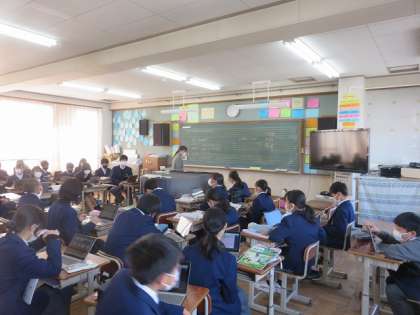 1年6組の音楽は、日本民謡をGIGA端末を活用して聴き、グループで分担してその特徴を調べ、情報を共有し発表しました。今回の授業を通して、日本民謡に親しむことができたのではないでしょうか。