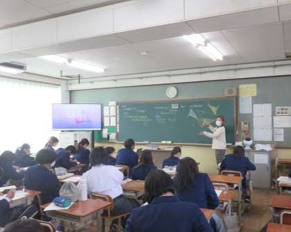 1年2組の数学は、平面図形の移動について学習しました。平行移動や回転移動の特徴を学び、生徒からもそれぞれポイントとなる性質についての発言が出て、みんなで共有をしました。