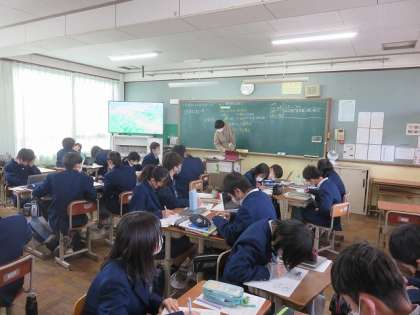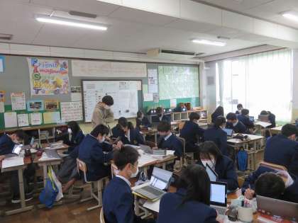 1年3組の社会は、律令国家についての用語や歴史的な流れをみんなで確認した後、大宝律令によって政治がどのように変わったのかを、各自でGIGA端末を活用して調べながら考え、グループの仲間にわからないところを訊きながら、整理をしました。