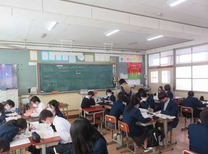 2年7組の社会は、江戸時代に朱印船貿易を行った目的と、幕府が貿易統制へと政策を変えた理由について、資料を基に各自で考え、グループで意見を出し合いました。