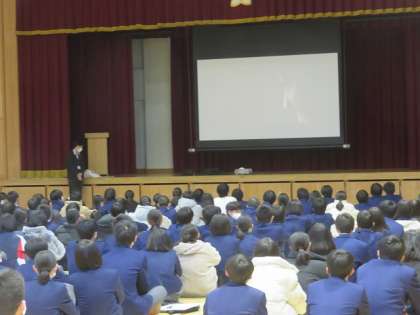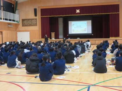 2年生が体育館で情報モラル教室を行いました。京都市教育委員会から講師の方を招き,携帯電話やインターネットでのトラブルについての動画を視聴した後,トラブルにならないためにはどのような行動をすればよいか,学年みんなで考えました。SNSの利用が多い社会です。今回の学びを生かして上手にSNSを利用してください。