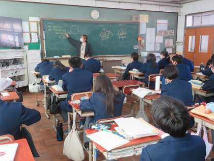 1年2組の数学は、円周率について学習しました。小学校では3.14で計算をしましたが、中学校からはπで表すことを学び、それを使った練習問題を行いました。