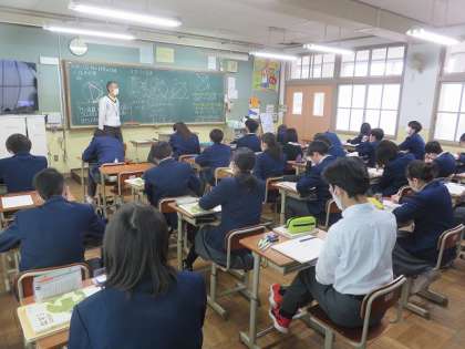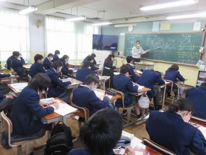 3年3組の数学は、円の性質の利用を学習しました。今までに学んだ相似な図形の性質や円周角の定理などを利用して、新たな定理を導くことができました。この後もしっかり振り返りをしておいてくださいね。