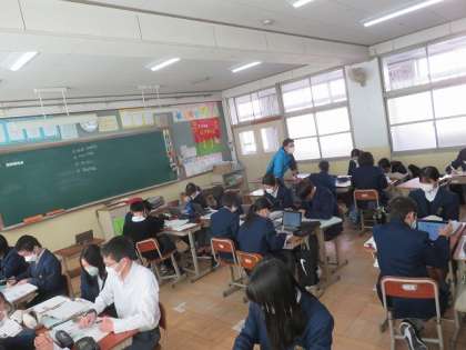 2年7組の理科は、今まで学習したことを基に、ワイヤレス充電のしくみについて解明する課題を行いました。各自で教科書やGIGA端末を活用して調べたり、グループの仲間に訊いたりしながら課題解決に向けて取り組みました。