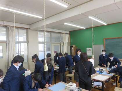 1年4組の家庭科は、巾着づくりで使う布を使ってアイロンをかける練習と、ミシンで縫う部分に待針を刺しました。みんなで協力しながら取り組むできました。巾着の仕上がりが楽しみですね。