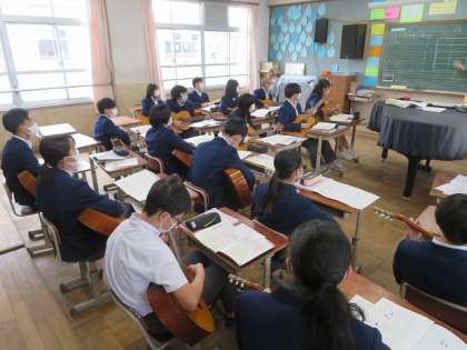 3年4組の音楽は、ギターの練習をしました。今日はGコードの練習をし、それを使ってみんなで曲を弾きました。難しかったと思いますが、みんな教え合いながらギター演奏を楽しんでいました。