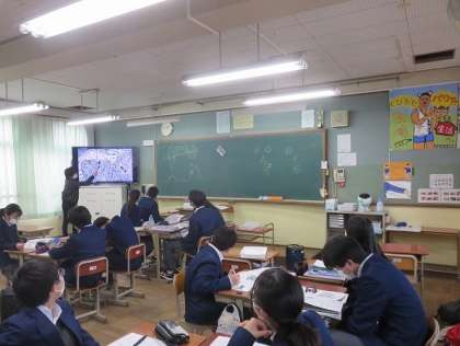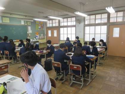 3年3組の社会は、地形図についての入試問題に挑戦しました。わからない問題はグループの仲間に訊いたり、またわかりやすく教えたりしながら、みんな最後まで考えることができました。