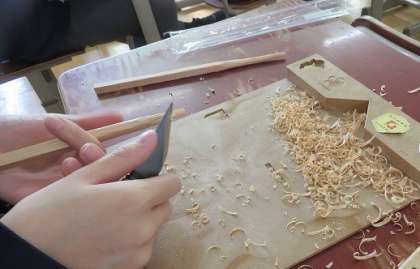 3年5組の美術は、お箸づくりを行いました。小刀の使い方を学んだうえで、木材を自分がデザインした形になるように切り出しました。みんな集中して制作に取り組んでいました。