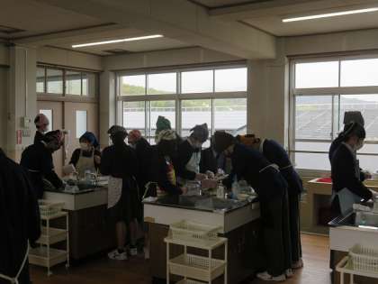 3年2組の技術・家庭科家庭分野も7組につづき、「水菜の豚肉巻き」を作りました。水菜を手際よく切ったり、蒸し器を準備したり、みんなで協力して作っていました。
