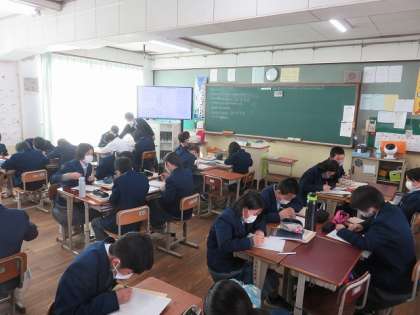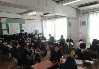 2年3組の数学は、ある事象を箱ひげ図とヒストグラムで分析し、それぞれのメリットとデメリットについて考え、グループ内で聴き合い、全体で共有しました。