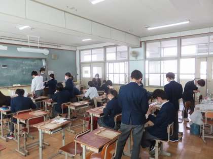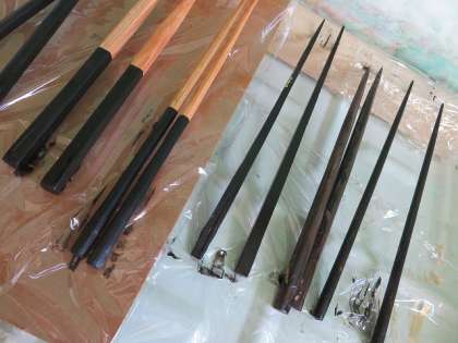 3年7組の美術は、お箸の制作を行いました。削り終わった人から紙やすりをかけ、胡桃油を塗る作業をしました。とてもうまく仕上がりましたね。