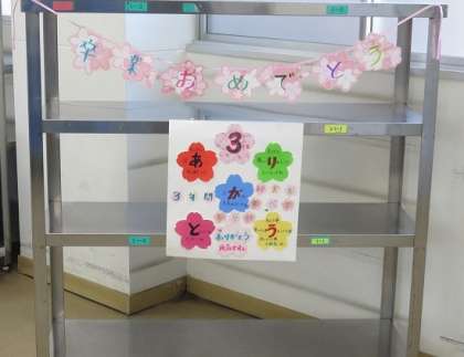 3年生は今日が樫原中学校で食べる最後の昼食となりました。クラスの仲間と食べる最後の昼食の味はどうでしたか?また、給食の配膳室では、配膳員さんが3年生に向けて素敵なメッセージを作成していただきました。ありがとうございました。