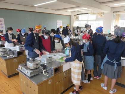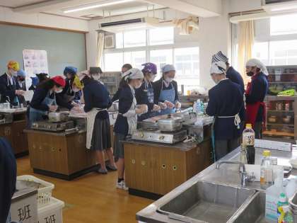 2年5組が調理実習を行いました。班で協力して、分量を量ったり、水菜を豚肉で巻きました。一口食べて「美味しい!」という声が聞こえました。
