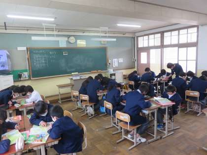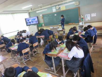 1年6組の社会は、「世界と日本の地域構成」の単元を行い、今日は地図帳を開き、それぞれの国や都市がどこにあるのか、グループで見つけながら、地図の見方について学びました。