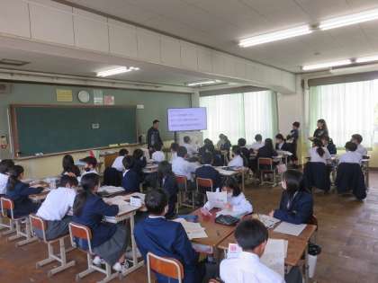 6限目に、1年2組、2年3組、3年6組で授業研究会が行われました。今年度からグループ活動を積極的に取り入れ、仲間や教科書をはじめとする様々な資料や文献、自己との対話を通し、深く思考し、学ぶ学習の実践を進めております。授業後は研究協議を行い、活発な議論が行われました。