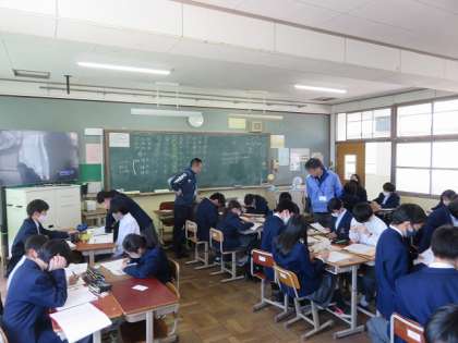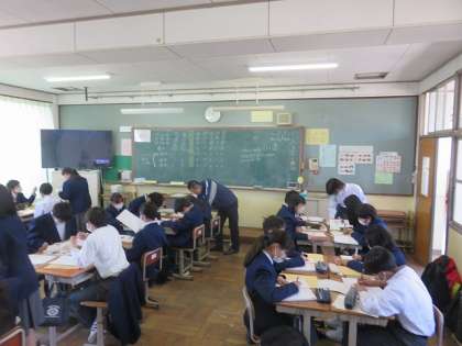 1年4組の数学は、正の数・負の数の足し算と引き算の演習を行いました。項が2つの計算や、3つ以上になった時の計算などを行いました。グループでわからない仲間に、わかりやすく教える姿を見ることができました。