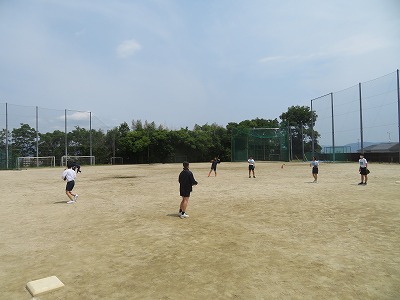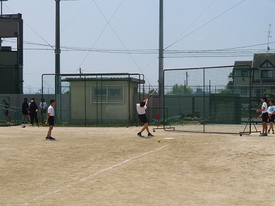 3年6組の保健体育はソフトボールに挑戦をしています。キャッチボール、ティーバッティングなどグループに分かれて練習をしました。