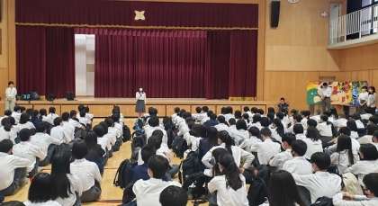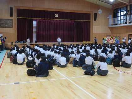体育館で結団式が行われました。今日から始まる修学旅行では普段ではできない体験をし、おおいに学び、仲間とともに大切な時間を過ごし、たくさんの思い出をつくってきてくださいね。