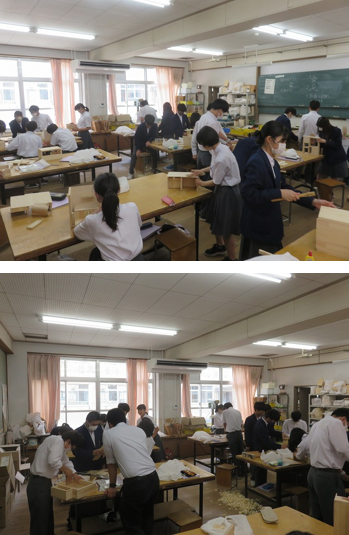 2年3組の技術は、オリジナルラックの制作を行いました。前時の続きで、完成に向けて、細かい部分を道具を使って削ったり、やすりで磨いたりし、仲間と協力していました。