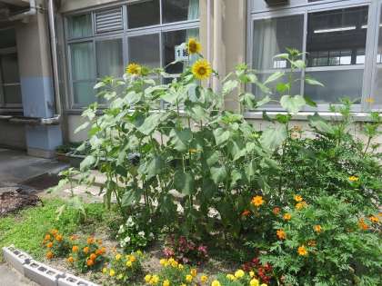 1組が中庭に植えてくれたヒマワリが太陽の下、立派に花を咲かせています。夏ですね。他のヒマワリもこれからどんどん花を咲かせます。楽しみです。