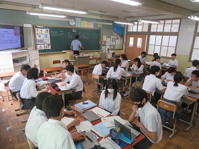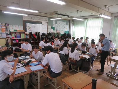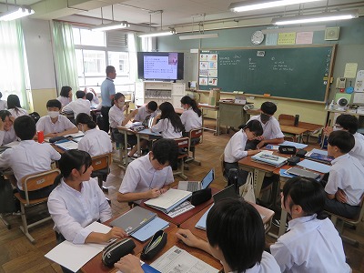 3年5組の英語は歩きスマホについて、取り締まる法律が必要か否かを議論した上で、英語でこのことについて意見文を書く授業を行っています。