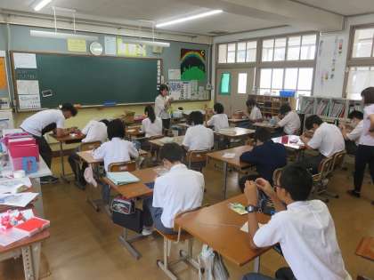 1・2年1組の家庭科は、コースター作りを行いました。今日は、針に糸を通して、布の端を縫うことを目標に、細かい作業を時間をかけて行っていました。