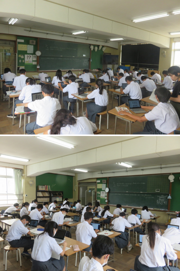 1年2組の美術は、絵文字を楽しく伝えるために、色や形、モチーフを組み合わせたアイデアを考えました。みんな漢字一文字から連想できるものを端末を活用しながら考えていました。