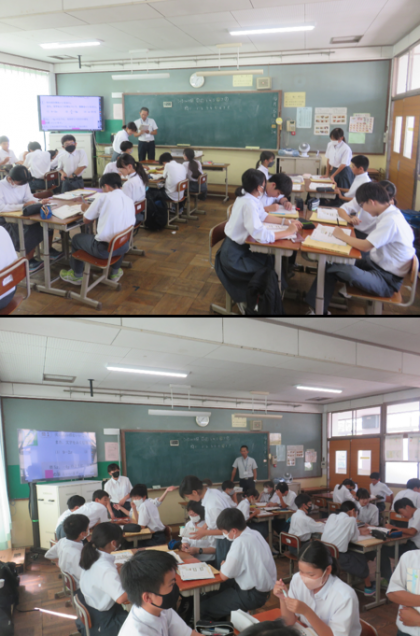 1年4組の数学は、文字と式について学習しました。文字を含む式の項と係数について、どこの部分が項なのか、また係数とは何かを各自で考え、仲間に訊きながら問題に取り組みました。