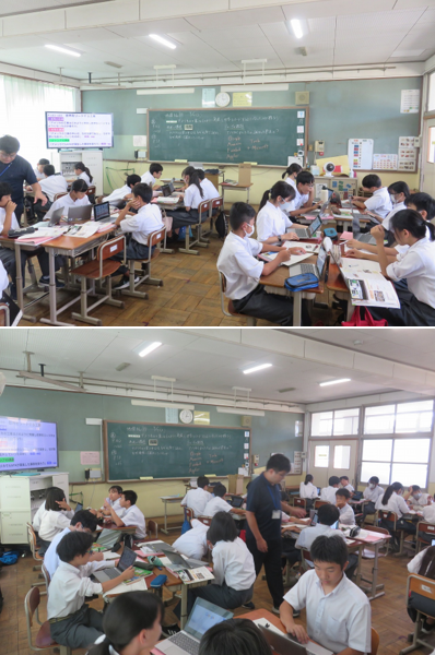 1年7組の社会は、アメリカの工業はどのように発展し、世界をリードするようになったかを探ることを目標に、アメリカ工業の中心がなぜ北部で誕生し、南部に拡大したのか、またGAFAがアメリカで誕生した要因について端末を活用して考え、グループの仲間の考えを聴き、各自でまとめました。