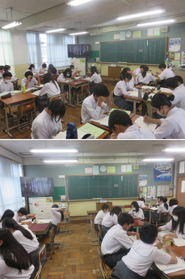 3年8組の国語は、2つの作品を読んで、それぞれの作品の筆者の主張とその根拠、具体例を各自で考え、グループの仲間の考えを聴き合いました。