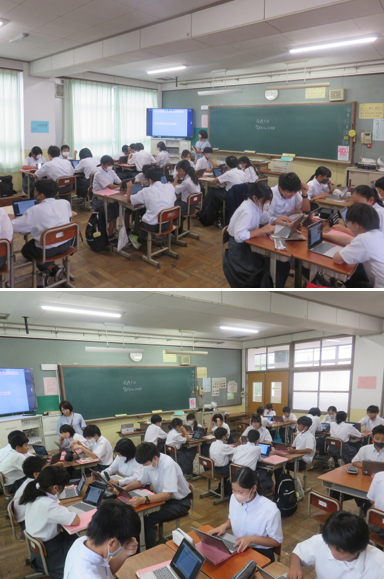 1年4組の家庭科は、各グループ内で地域や気候など共通の条件をつけて、個人で世界の民族衣装について調べました。その後、ロイロノートでまとめてグループ内で発表を行い、共通点や相違点について仲間と共有しました。