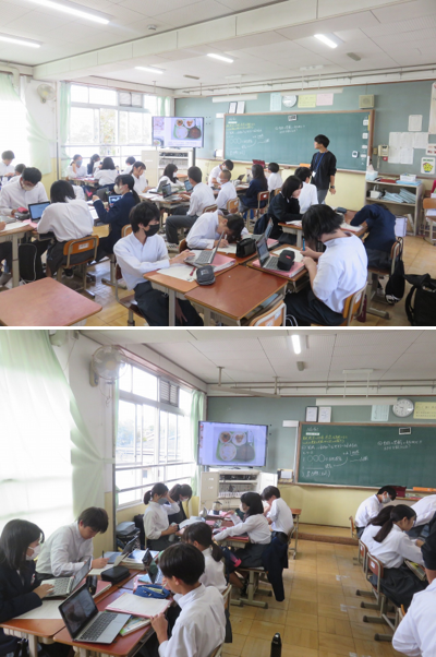 2年7組の社会は、東北地方の人々が冷涼な気候の下で、どのように農業を発展させてきたかを端末を活用し調べて、グループの仲間の考えを聴き合いました。
