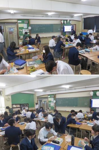 3年5組の美術は、前回の鑑賞をもとに、季節感や独自性、和菓子らしさなど様々な角度から確認しながら、粘土で和菓子作品を仕上げていました。細部までこだわり、本物そっくりな作品がいくつもありました。