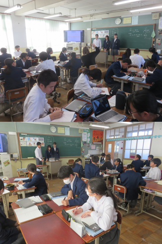 3年6組の英語は、日本の魅力を知ってもらうプレゼンテーションをすることを目標に授業を行いました。日本の美味しい食べ物や、お節料理にはそれぞれ意味があることをプレゼンするグループもあり、ALTのセラ先生も興味をもって質問し、それに対しても英語で答えることができていました。
