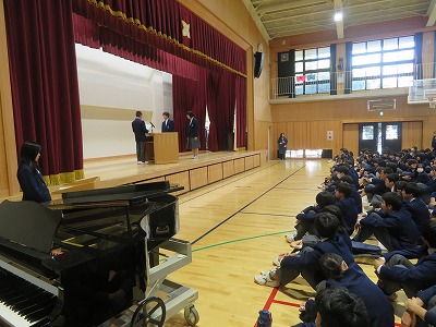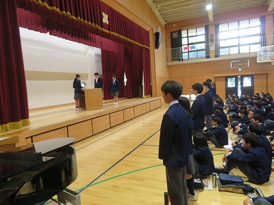 6限、体育館で生徒会本部役員、学級役員の認証式を行いました。