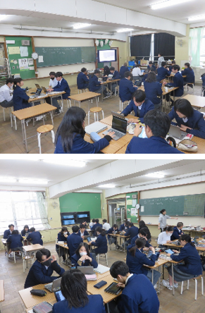 3年7組の美術は、グループごとに違く作者の「自画像」を鑑賞し、色彩などから、作者の心情や意図がどのようなものだったか考え、グループの仲間と意見を交わしました。