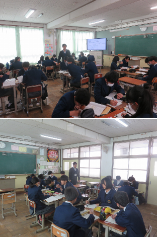 2年4組の数学は、二等辺三角形の性質について、与えられた条件から仮定等を探し、どの合同条件を使えばいいか考え、証明を行いました。グループの仲間の「わからない」に、わかりやすく教える姿がありました。