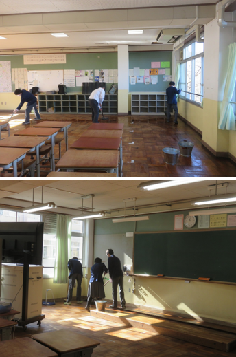 放課後に各クラスの代表が教室の油引きを行ってくれました。クラスの仲間が3学期のスタートを気持ちよく切ることができます。ありがとうございます。