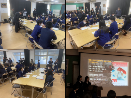 放課後に桂川中学校で西京支部の生徒会交流会が行われ、樫原中学校からも新旧の生徒会本部役員が参加してくれました。支部目標「keep connecting」をもとに各校の取組についての発表がありました。またグループワークでは旧本部役員から取組の紹介をし、新本部役員は取組について質問をし、これからの取組の参考にしました。他校の意見も聴くことができ、とても有意義な交流会でした。参加してくれた本部役員のみなさん、ありがとうございました。
