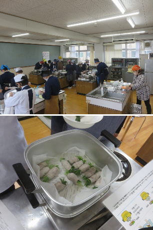 2年4組の家庭科は、調理実習を行い、水菜の豚肉巻きを作りました。グループ内で協力して手際よく水菜を切ったり、蒸したりして、時間に余裕をもって調理することができました。美味しく仕上げることはできましたか?