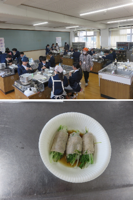 2年2組の家庭科は、調理実習で水菜の豚肉巻を作りました。事前学習で確認した手順通りに調理をし、時間に余裕をもって作ることができました。料理の味はどうでしたか?