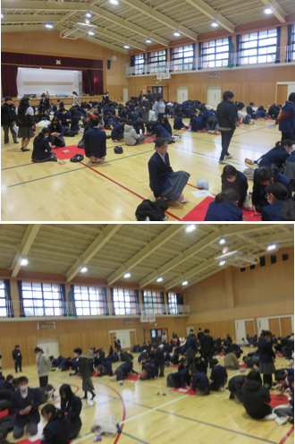1年生が百人一首大会を行いました。各クラスの仲間がそれぞれにグループに分かれ、クラス対抗で行われました。上の句が読まれた瞬間に「はいっ」と札を取る声が聞こえてきました。これまでに覚えた札を取ることはできましたか?